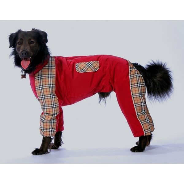 Комбинезон из плащево-курточной водо- и ветроотталкивающей ткани, утепленный подкладкой из флиса/ полартека. Предназначен для выгула собак в холодную/морозную погоду. Производится на все породы собак. Варианты исполнения: цельнокроеный одноцветный с вариантами отделки:светоотражающая лента/атласный кант или полоска плащевки другого цвета/«шотландки» или рюша + карман /декоративный клапан; разрезной комбинированный из двух сочетаемых по цвету однотонных тканей с вариантами отделки: лампасы или светоотражающая лента/атласный кант/карман/декоративный клапан;разрезной комбинированныйсочетание однотонной ткани с клеткой-«шотландкой». Отделка: атласный кант на границе тканей + карман /декоративный клапан; разрезной комбинированныйсочетание однотонной ткани с «вязанкой» плащевой тканью, имитирующей «вязаную» фактуру.Воротник: стойка из двойного трикотажа или двойной плащевки. Застежка: разъемная молния типа «трактор». Штанины: нижняя часть собрана на резинку.