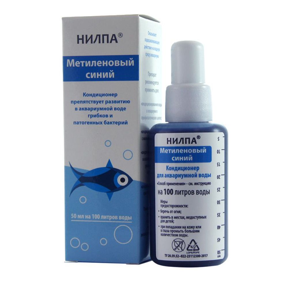 Кондиционер препятствует развитию в аквариумной воде грибков и патогенных бактерийКомплектность:Флакон с кондиционером 50 мл инструкция по применению Инструкция по использованию кондиционер «Метиленовый синий» Кондиционер для аквариумной воды. Оказывает оздоравливающее действие на водную среду аквариума. Препятствует размножению в аквариуме патогенных грибков родов сапролегния и ахлия, а также нежелательных бактерий. Область применения: Используется для кондиционирования воды в аквариумах, карантинных емкостях и в инкубаторах икры рыб. Препарат рекомендуется применять для: кондиционирования воды в аквариуме в профилактических целях; кондиционирования воды с икрой и мальками рыб; кондиционирования воды в аквариуме с высоким уровнем азотных соединений; кондиционирования воды при перевозке рыбы. Применение кондиционера НИЛПА®«Метиленовый синий» делает водную среду безопасной для рыб и икры, так как он препятствует размножению и расселению болезнетворных организмов, в первую очередь грибков. Способ применения: Непосредственно перед внесение кондиционера НИЛПА® «Метиленовый синий» в аквариум рекомендуется заменить 30% воды. В качестве подменной воды надо использовать отстоянную в течение не менее суток водопроводную воду. В аквариумах с мягкой водой перед подменой следует измерить рН (Использовать НИЛПА®«pH тест»). Если значения этого показателя в аквариуме и в подменной воде различаются более чем на одну единицу, то частичная замена воды осуществляется в два этапа с интервалом в 3-5 часов. Сначала следует подменить 20% воды, потом еще 20-30%. Так как кондиционер разрушается при воздействии ультрафиолетовых лучей и легко удаляется из аквариума с помощью активированного угля и цеолита, перед внесением его в аквариум необходимо убрать картридж с сорбентами из фильтра и выключить ультрафиолетовый стерилизатор. Также не рекомендуется во время кондиционирования оставлять в фильтрах материалы, удаляющие из аквариума аммиак, фосфаты, нитриты и нитраты. Наполнители, обеспечивающие механическую фильтрацию и биофильтрацию, не препятствуют оздоравливающему действию кондиционера. Кондиционер может снижать активность нитрифицирующих бактерий, поэтому во время его применения желательно воспользоваться препаратом НИЛПА® «Антиаммиак». Во время кондиционирования следует аэрировать аквариум. Кондиционер является сильным красителем, после его применения возможно окрашивание силиконовых трубок и шлангов, элементов декорации аквариума. Особенно заметно окрашивание при использовании кондиционера в аквариуме с известняком и известковым туфом. После использования кондиционера рекомендуется заменить 35% воды и с интервалом в одни сутки опять подменить воду на одну треть. Быстро удалить остатки кондиционера и полностью устранить окрашивание воды можно с помощью активированного угля. Дозировка: В качестве оздоравливающей водную среду аквариума профилактической дозировки, для кондиционирования воды с мальками и икрой, при использовании кондиционера в качестве антидота при отравлении рыб нитритами и/или нитратами, а также для транспортировки рыб используют 5 мл кондиционера НИЛПА®«Метиленовый синий» на 10 литров воды. Для борьбы с патогенными грибками допустимо удвоить или даже утроить указанную дозировку. Кондици